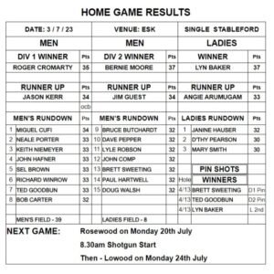 The next game is at Rosewood on Monday 17th July. It is now an 8.30am Shotgun start. The Timesheet is available at Rosewood Golf Club.