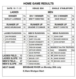 Players numbered 60 (47 men and 13 ladies), which included one new member. The field moved very well especially in the area near the section which held the Pony Club meet on the weekend. With handicapper John Hunter away for a couple of weeks, we appreciate wife Lorraine’s help in getting the scores entered for Tuesday’s game.