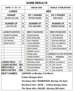 The next game is an 8.30am Shotgun start at Lowood on Monday 31st March. At the following game at Rosewood on Monday 7th April we host our visitors from Woodford. It will be a 9.00am Shotgun start to allow Woodford players to arrive and to have some nourishment.